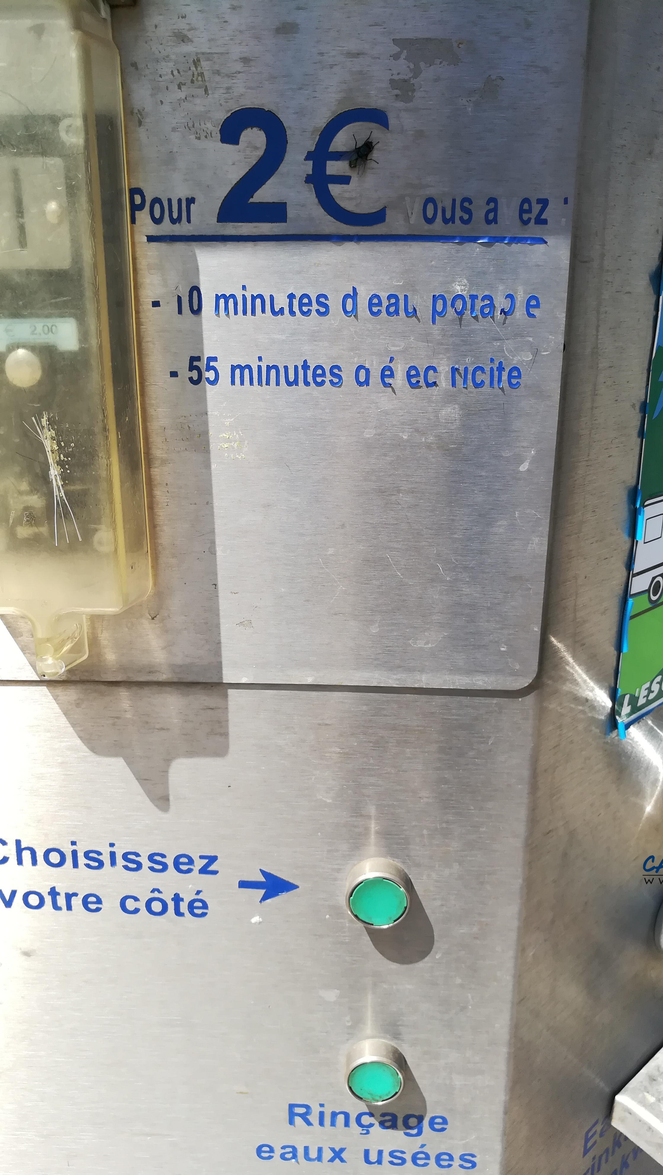 Prix des services : 2 euros en pièce (10 mn d’eau et 55 mn d’électricité)