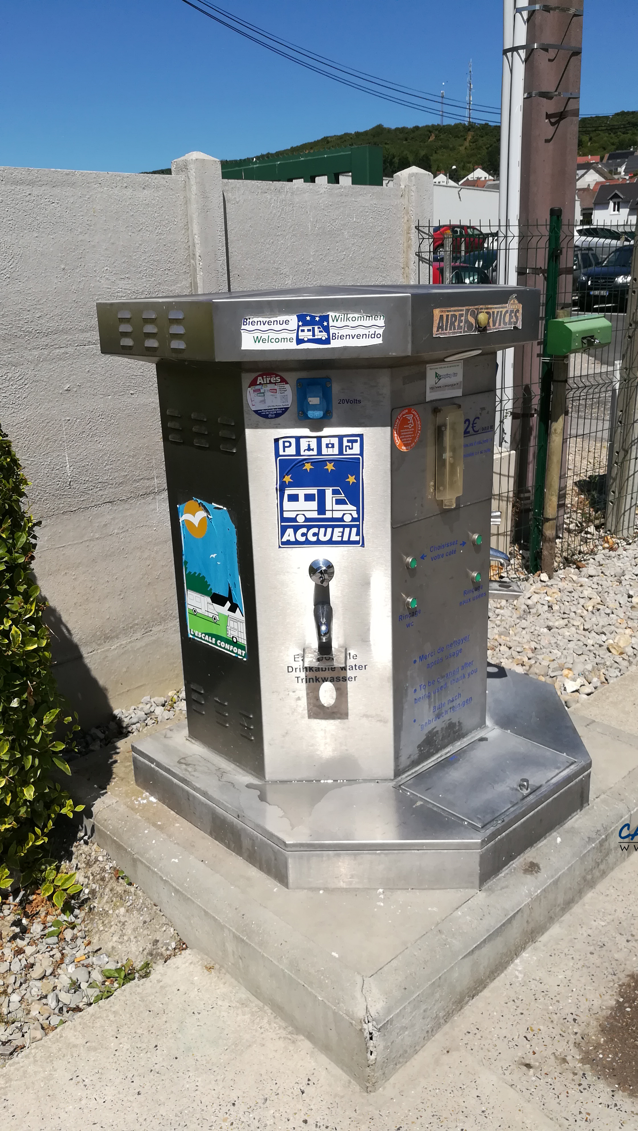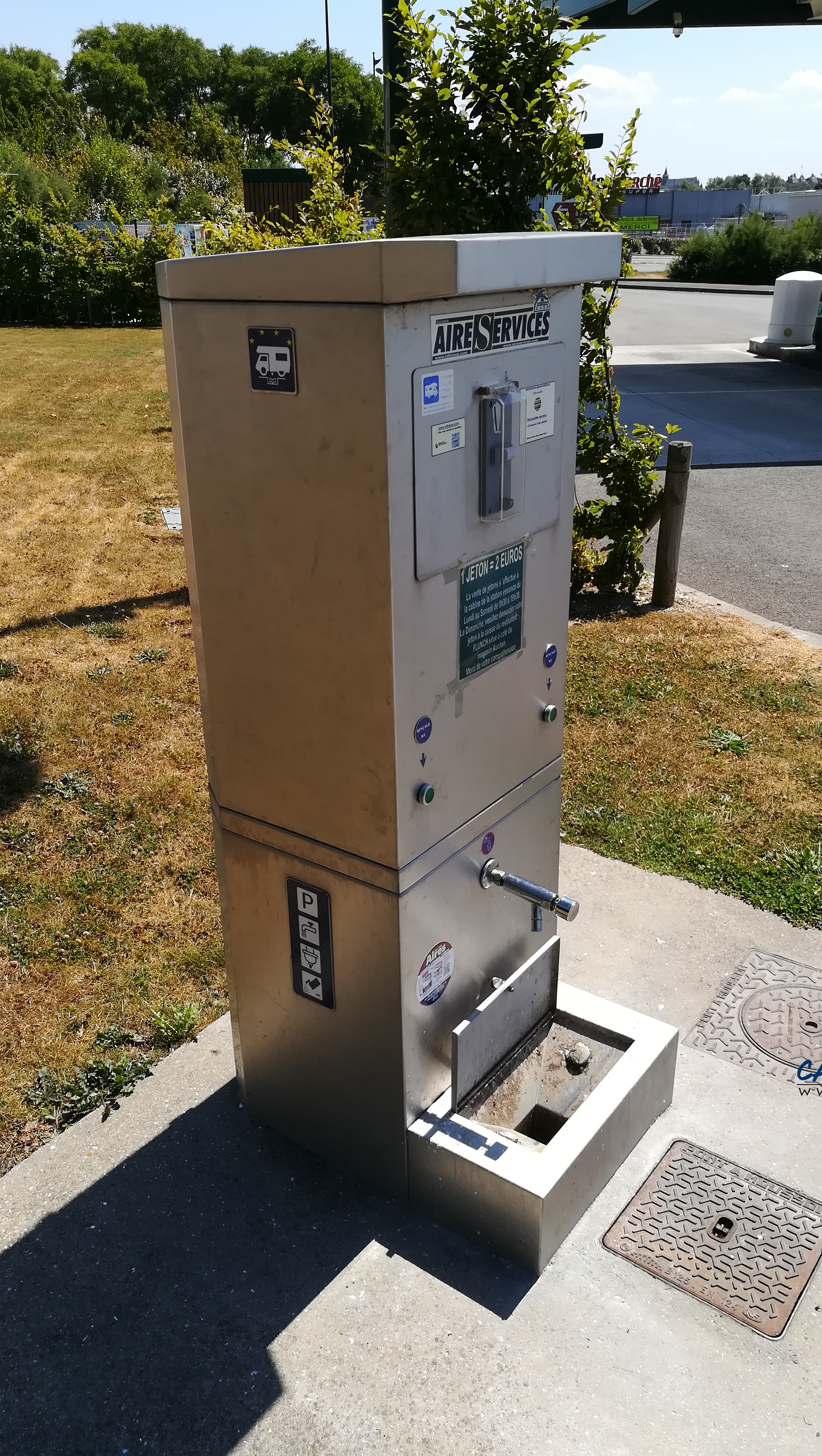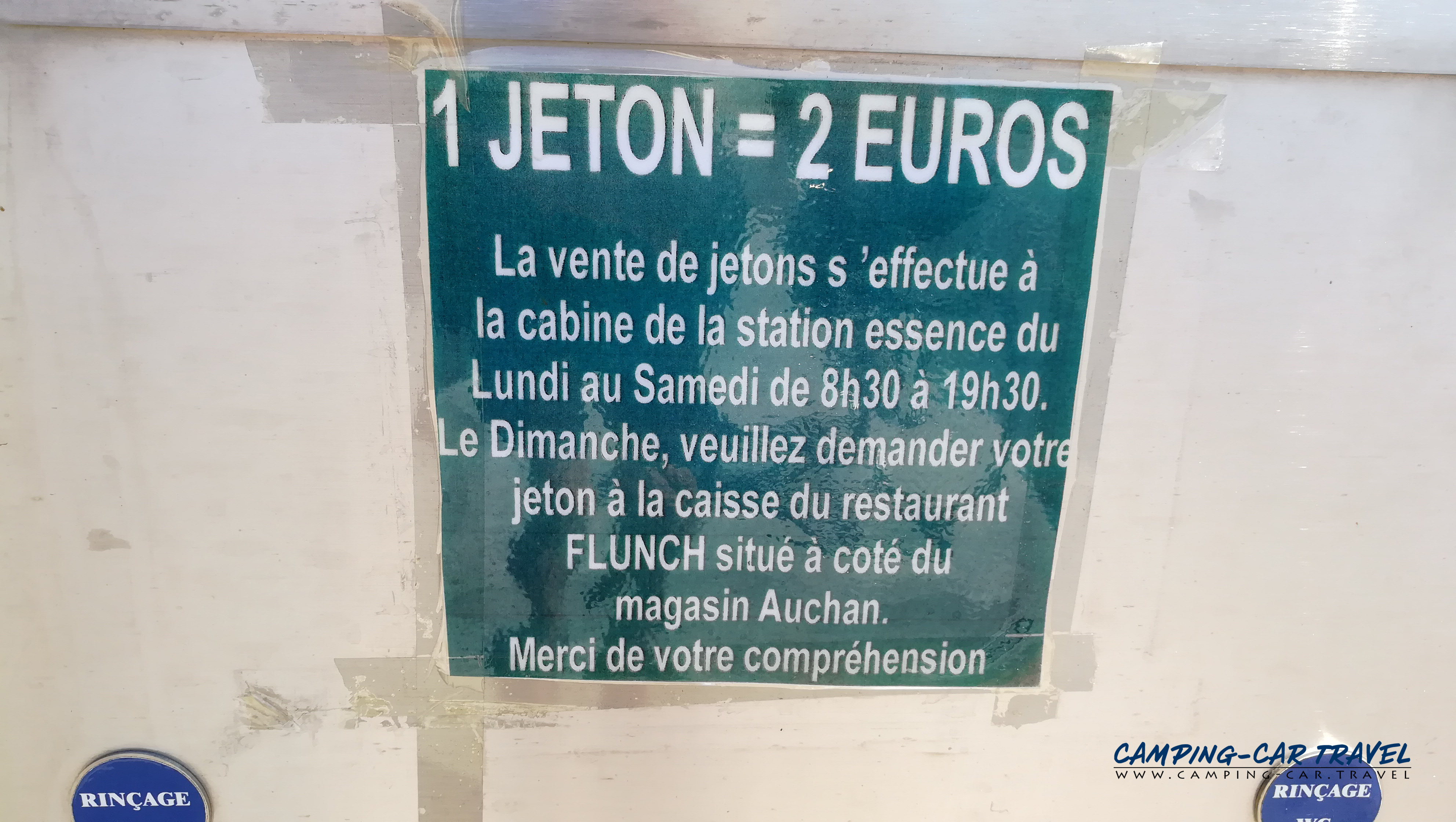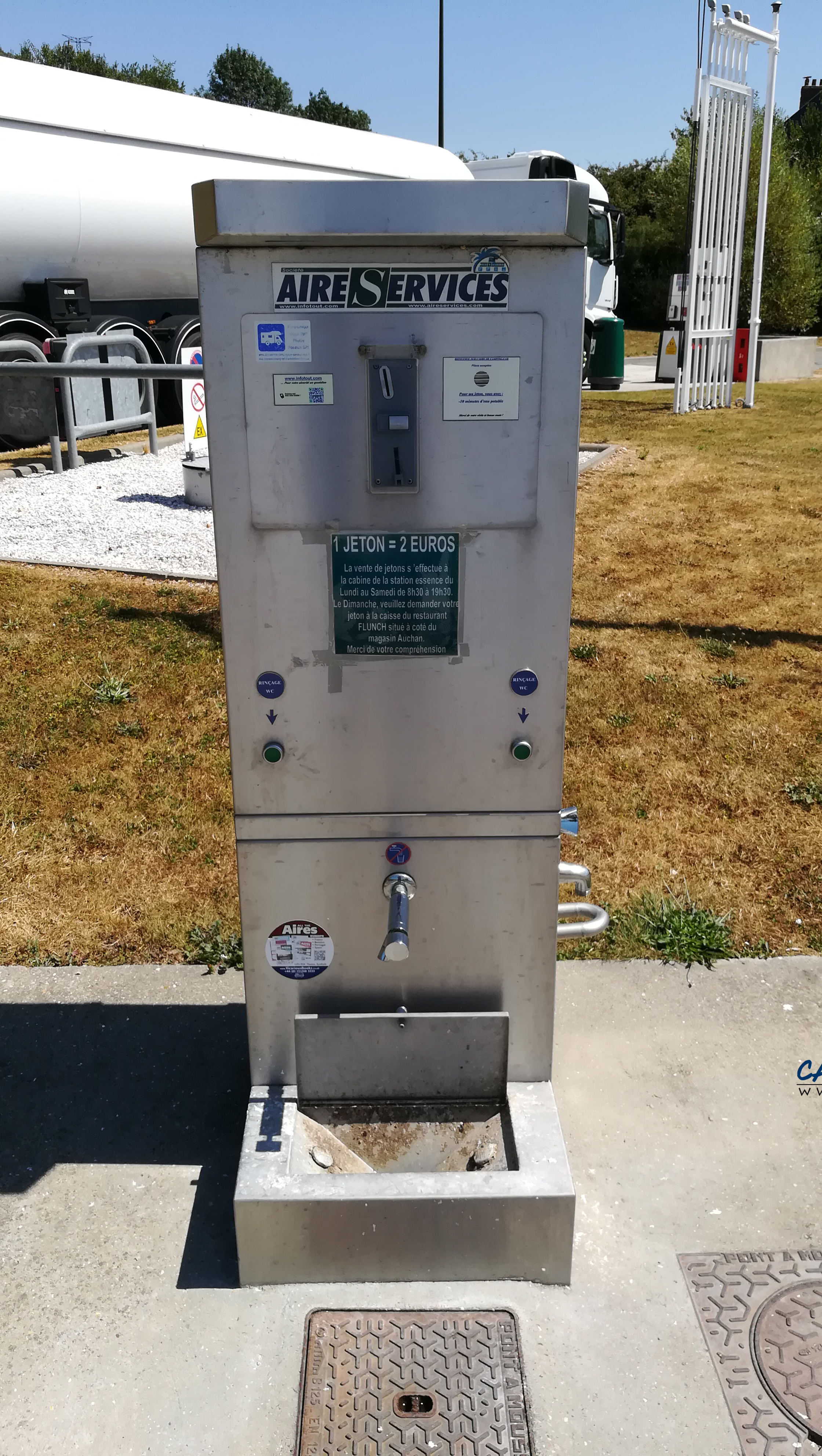 La première borne se trouve à la station essence du supermarché Auchan. Elle utilise des jetons disponibles à la caisse de la station ou à Flunch quand elle est fermée.
