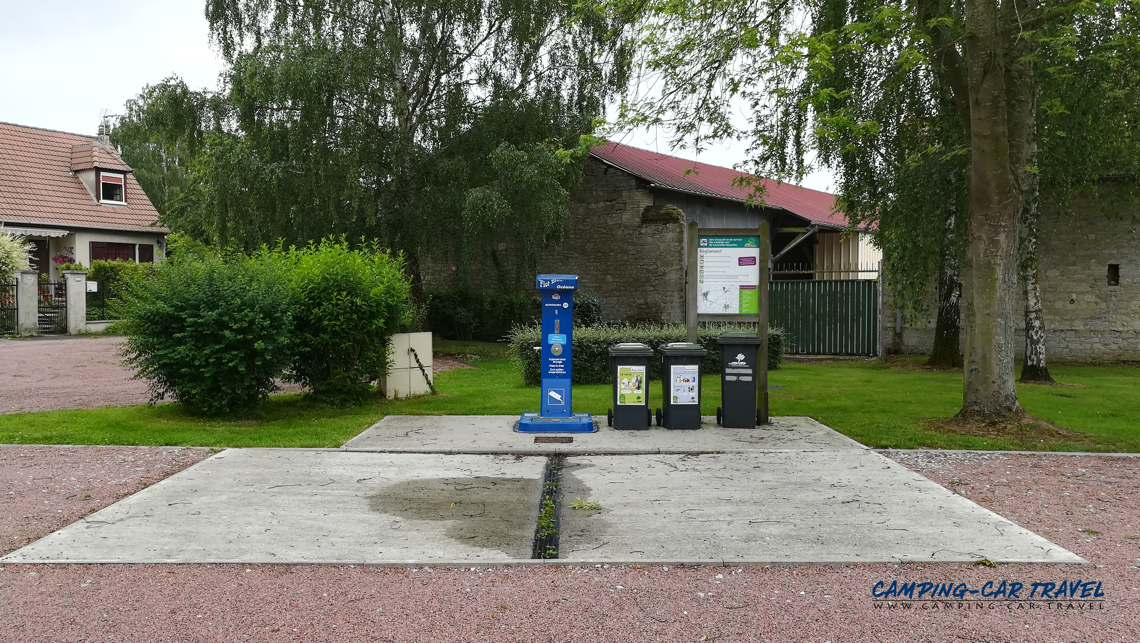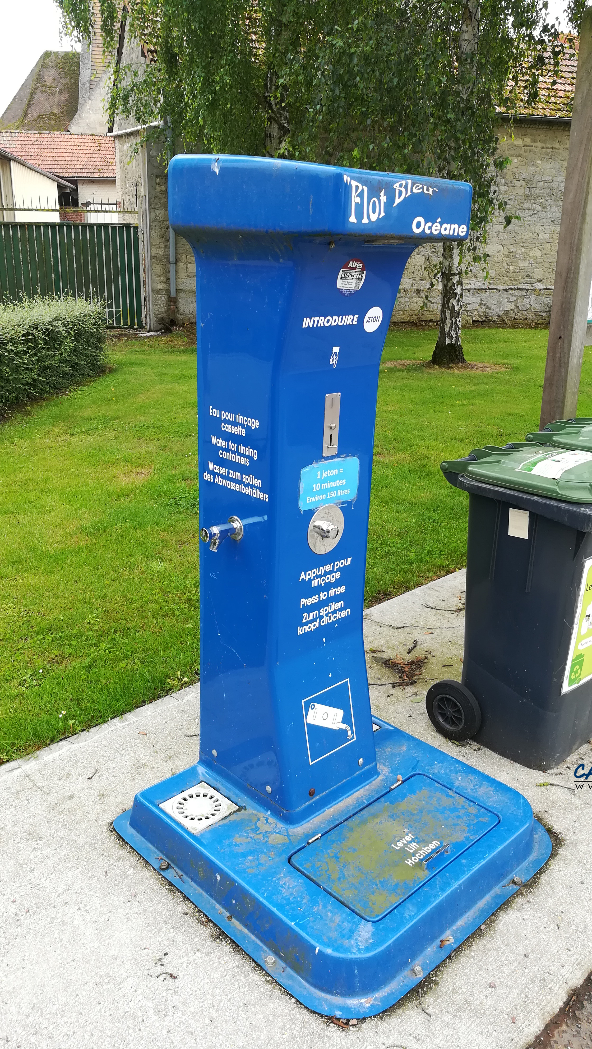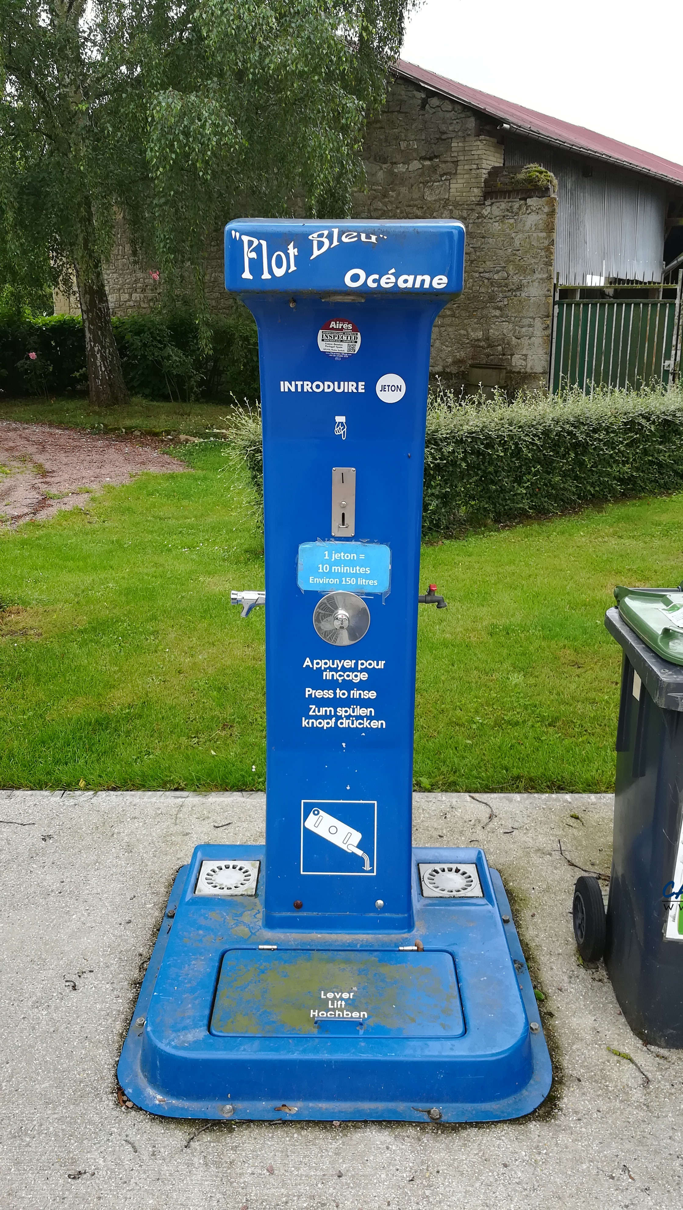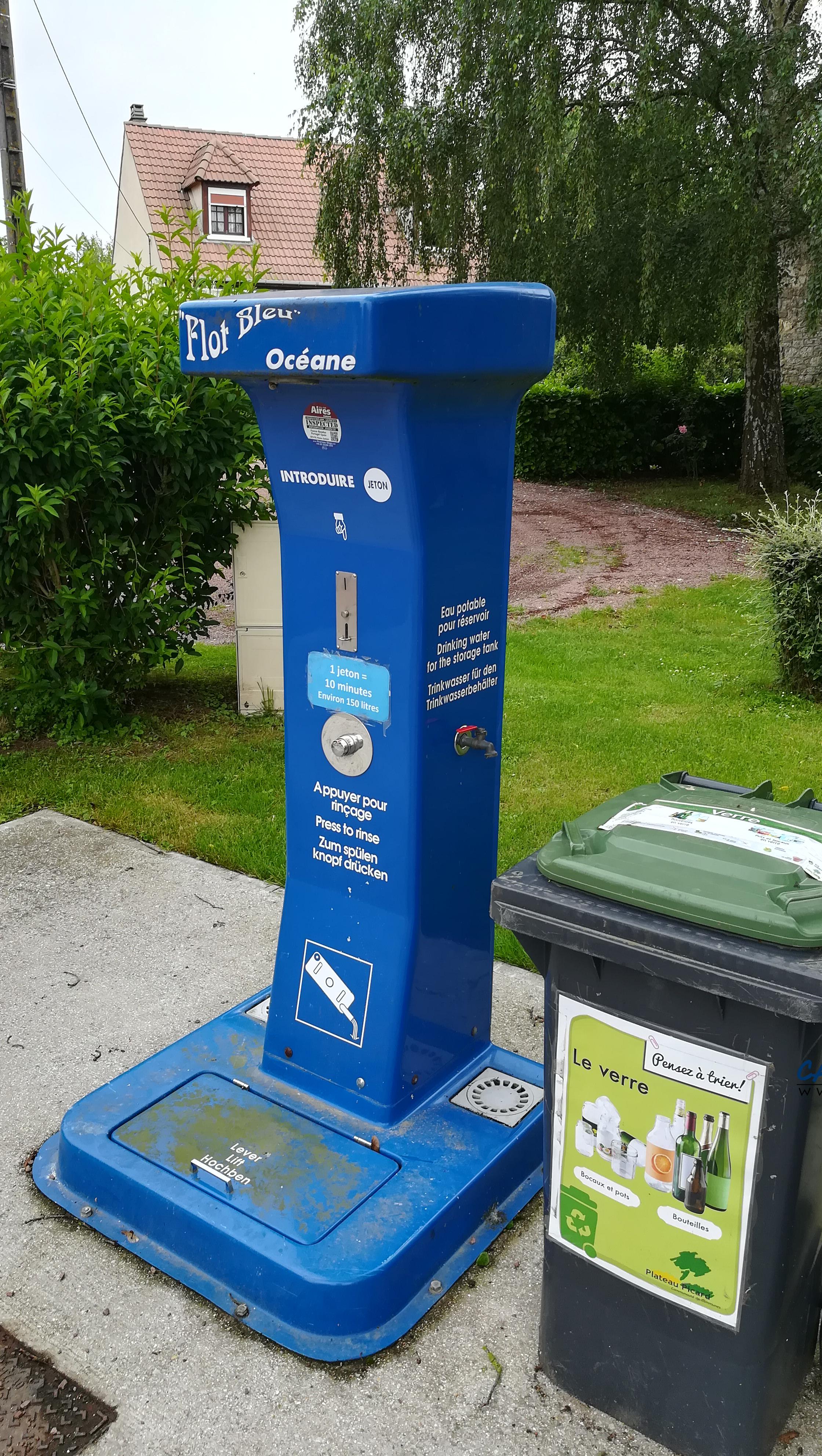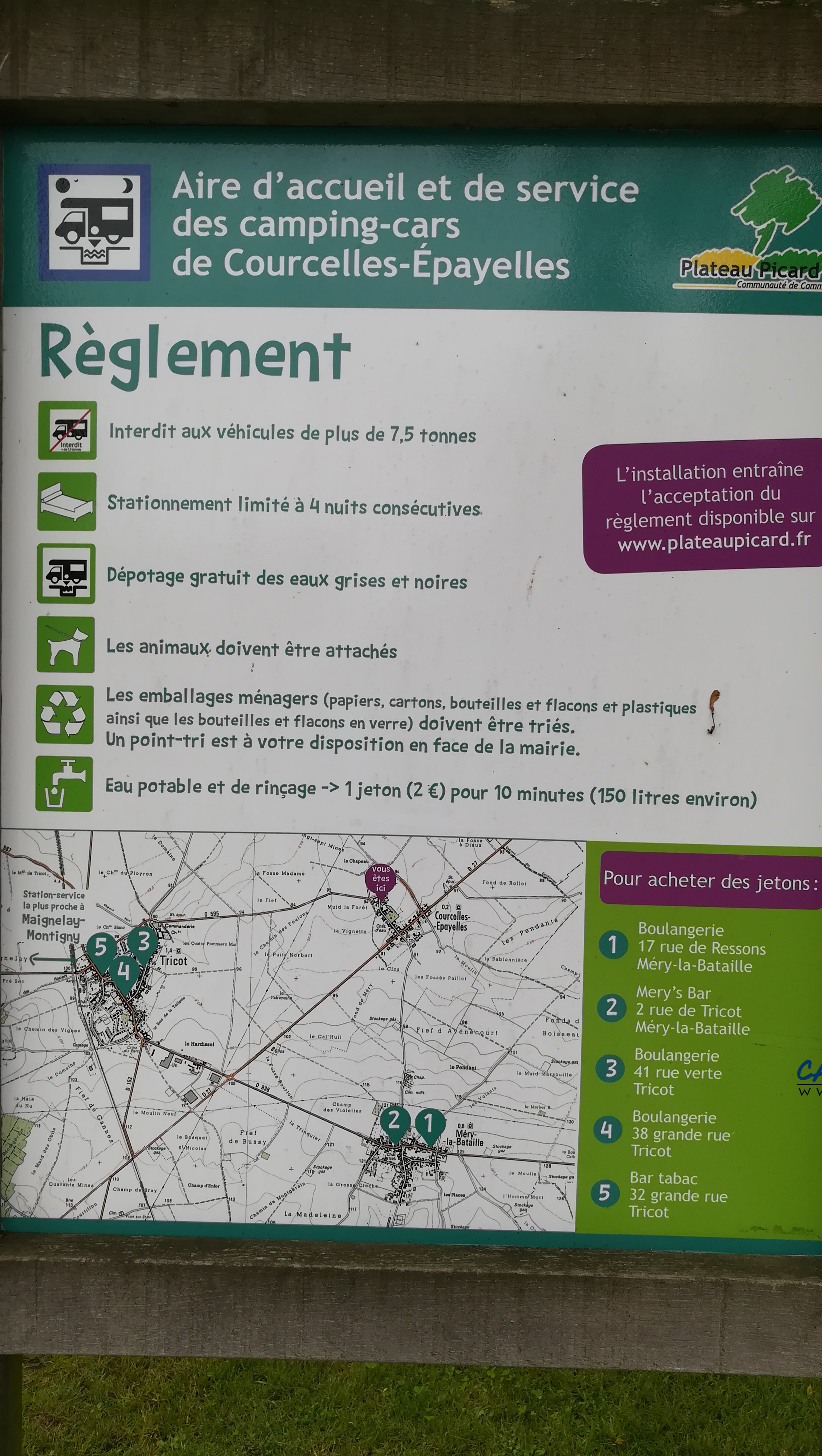 La borne fonctionne avec un jeton à deux euros disponible dans la ville voisine de Tricot à trois kilomètres. Vous y trouverez aussi une boulangerie.