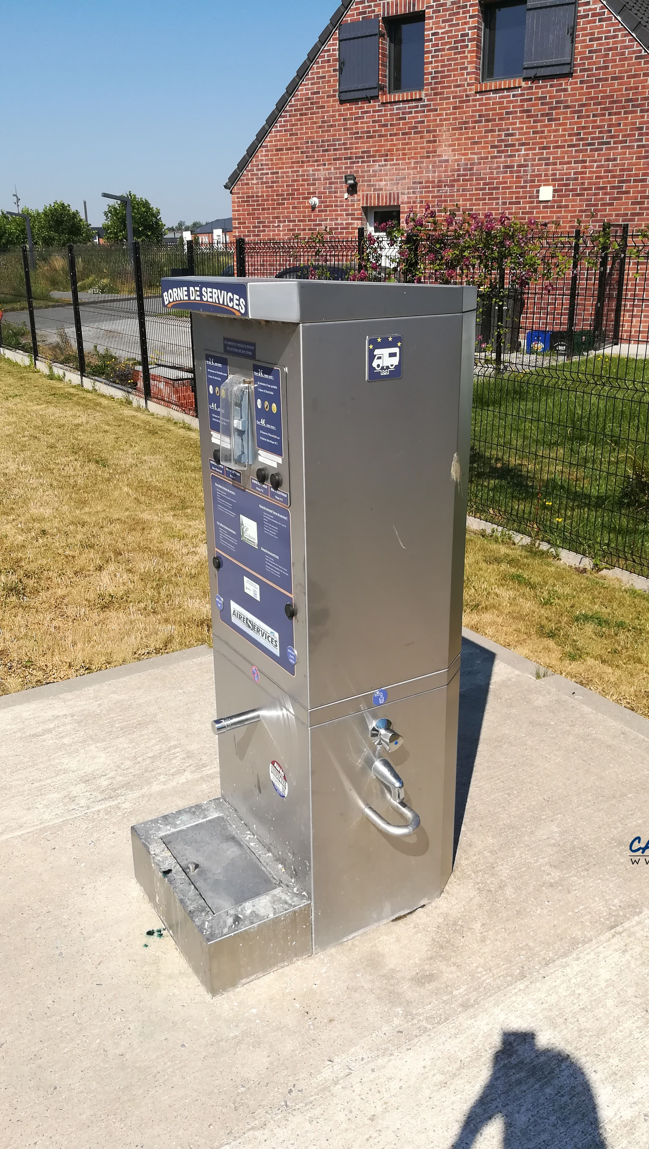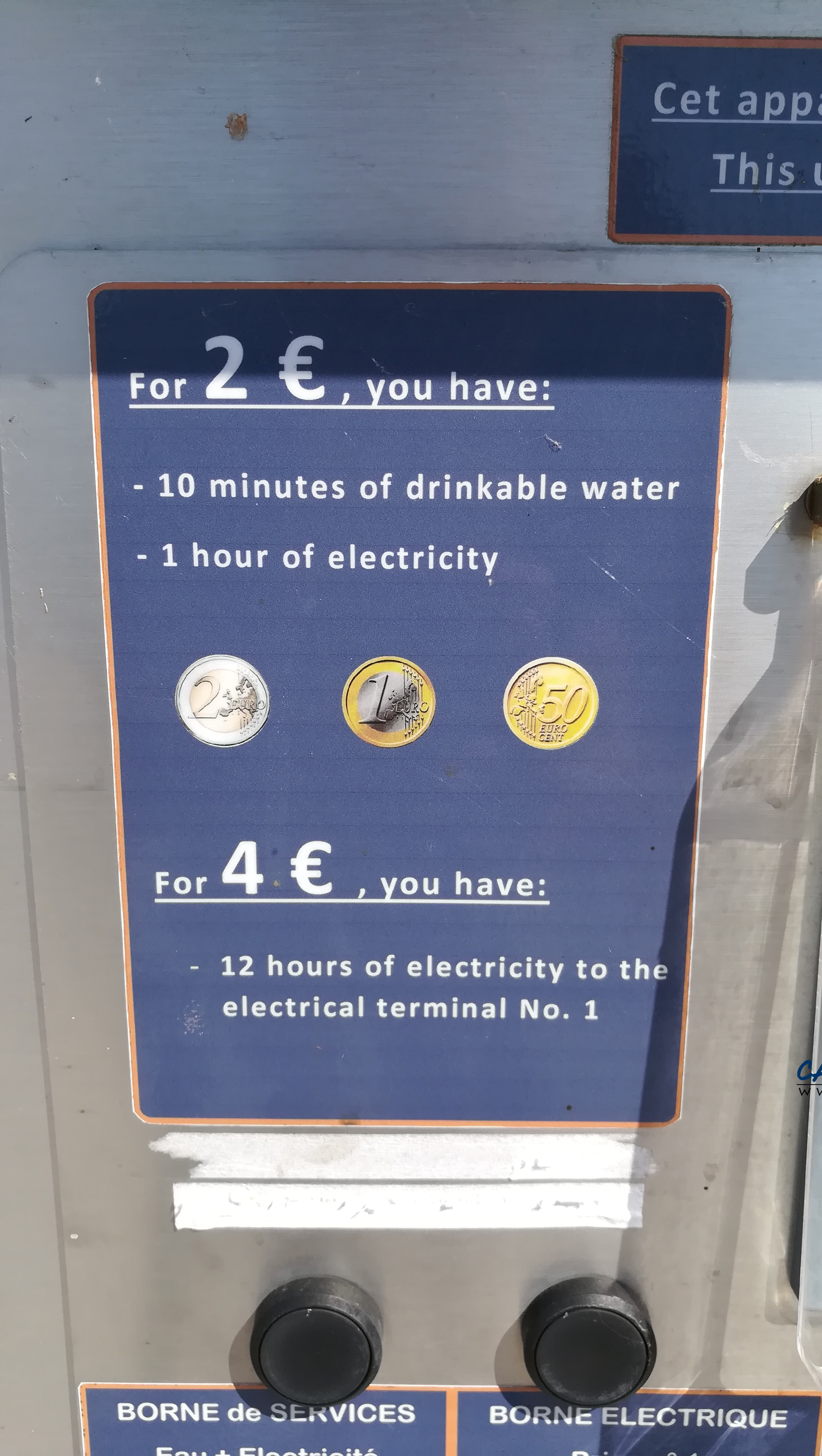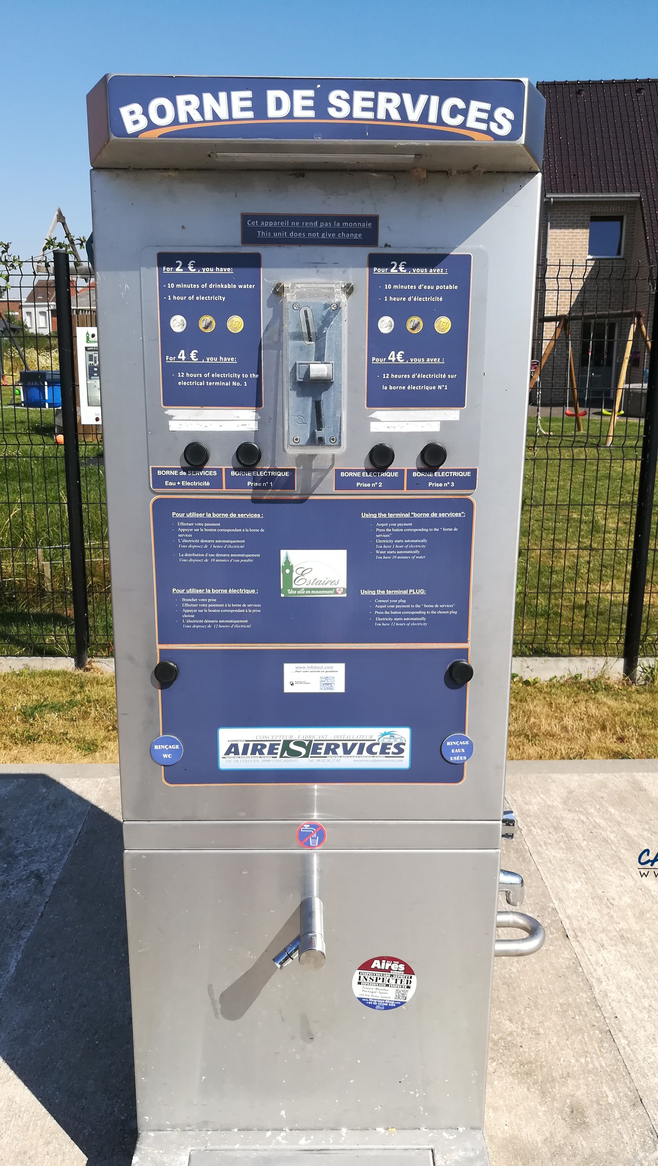 Vous pouvez choisir entre 10 minutes d’eau et 1 heure d’électricité ou bien 4 euros pour 12 heures d’électricité. Une borne électrique est implantée près des places de stationnement.