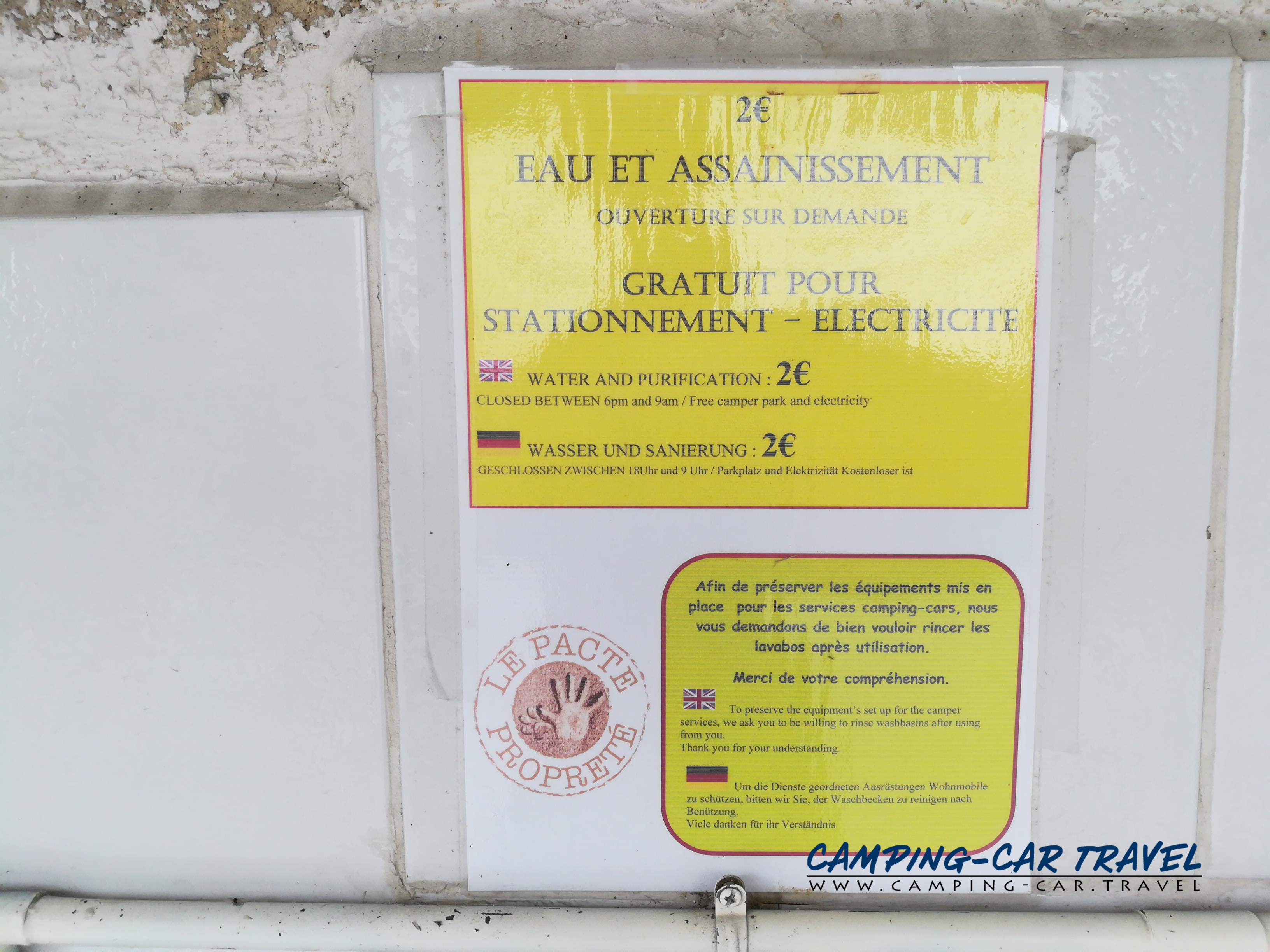 Prix des services : 2 euros pour l’eau (pas de durée imposée), électricité gratuite.