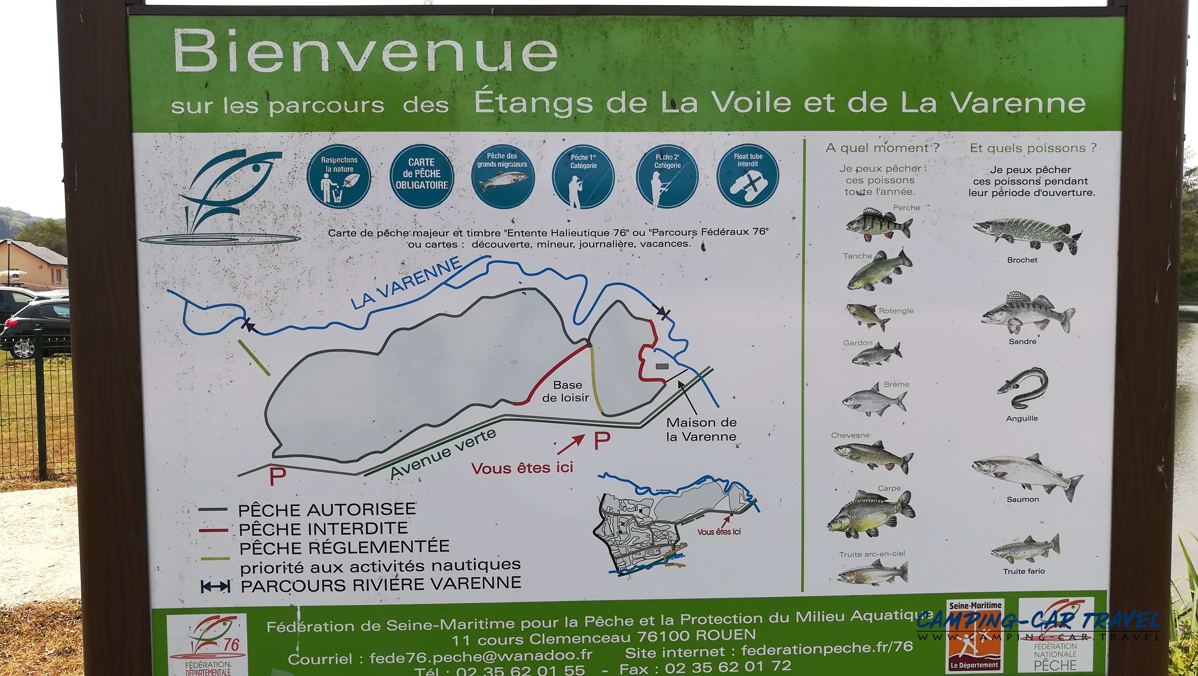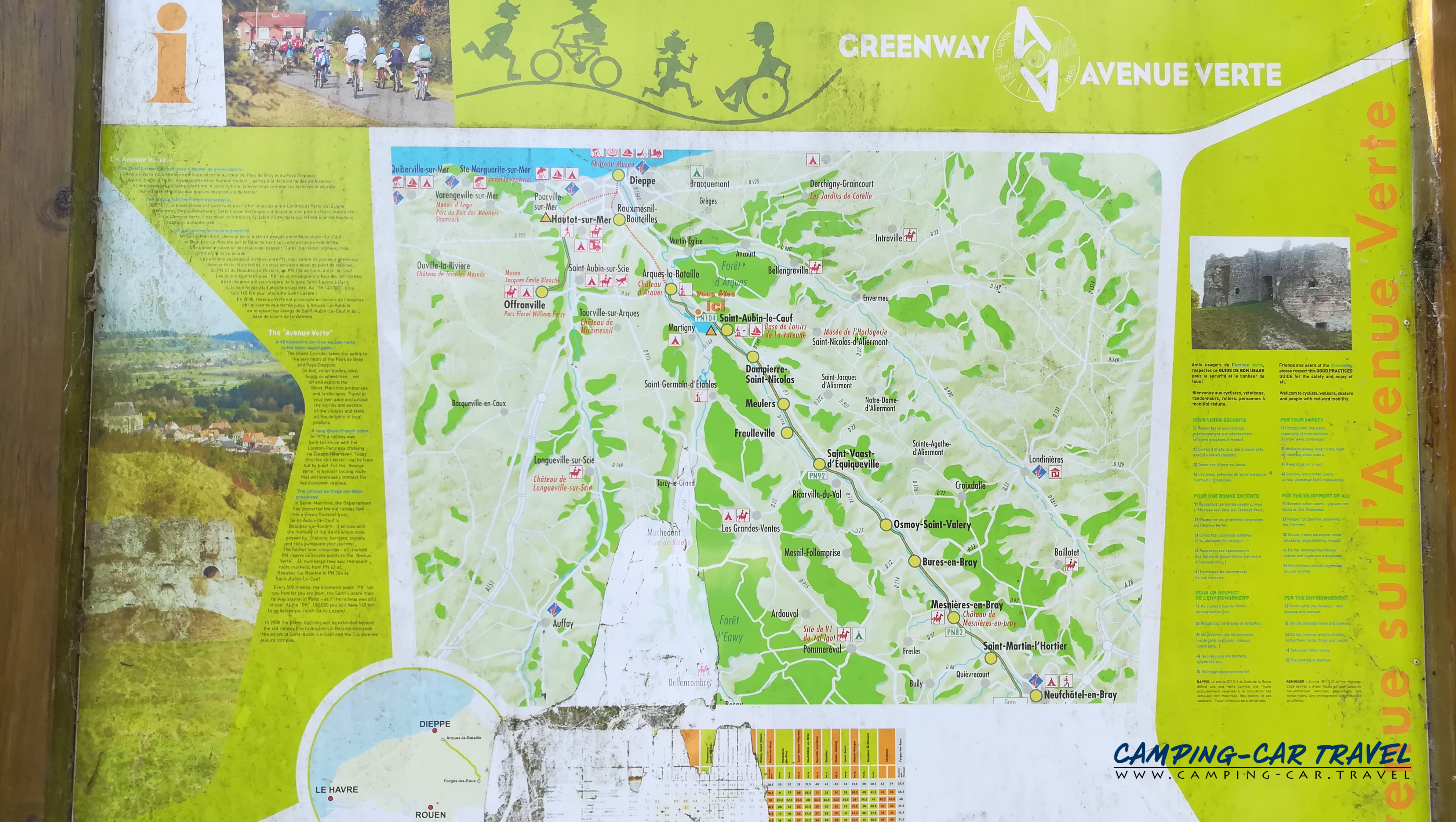 L’atout majeur de ce stationnement est son emplacement au départ immédiat de l’Avenue Verte : cette voie douce de 56 kilomètres relie Dieppe à Forges-les-Eaux en suivant le tracé de l’ancienne voie ferrée. Accessible gratuitement aux piétons, cyclistes, rollers et personnes à mobilité réduite, elle traverse forêts et vallées, s’inscrivant dans le projet européen de l’Avenue Verte Londres–Paris. Autour, 140 km de circuits balisés permettent d’explorer à pied et à vélo les vallées de la Béthune et de l’Eaulne, en longeant les étangs où pêcheurs et promeneurs se croisent toute la journée.