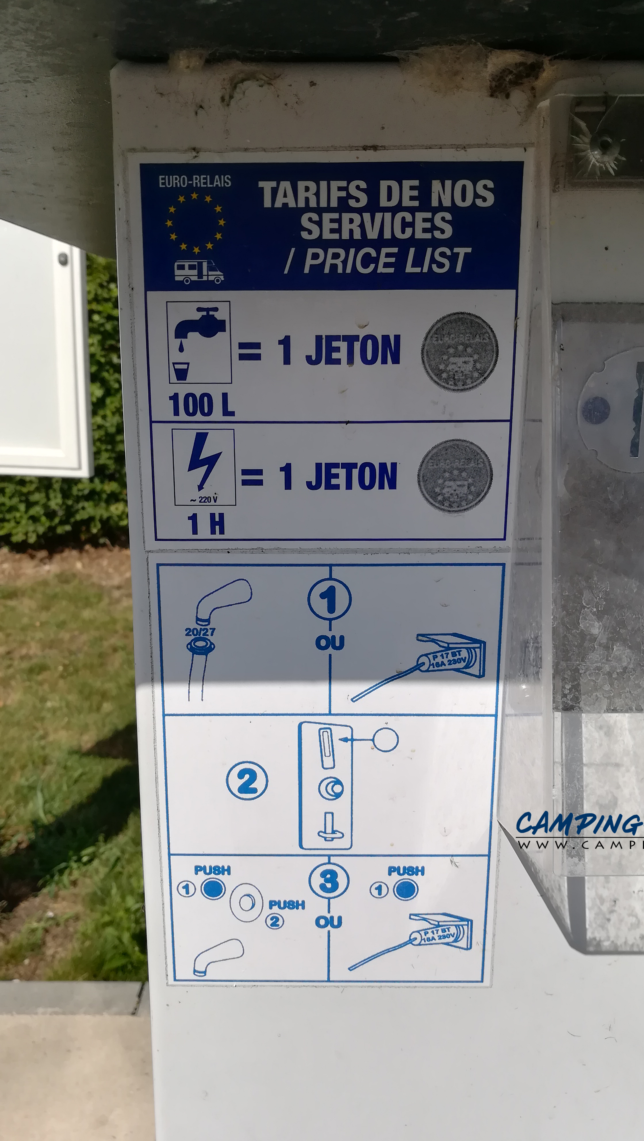 La borne fonctionne avec un jeton à 2 euros pour 100 litres d’eau ou 1 heure d’électricité.