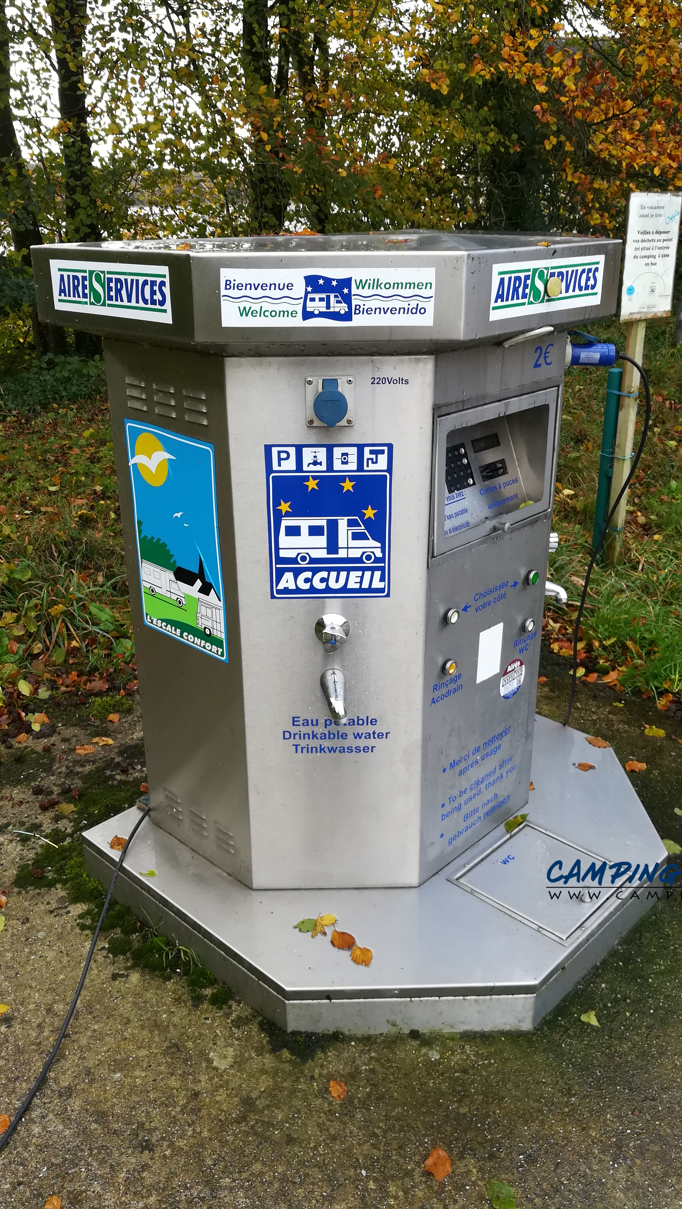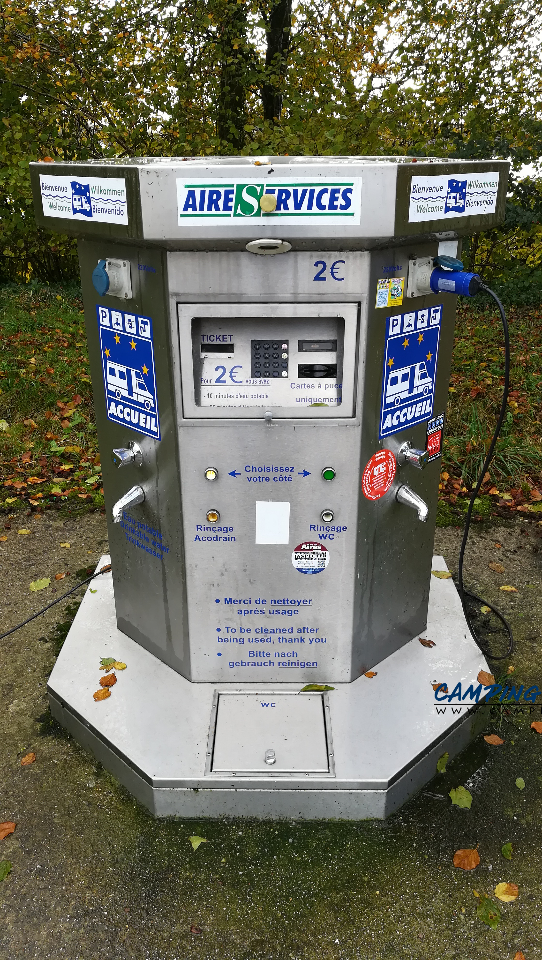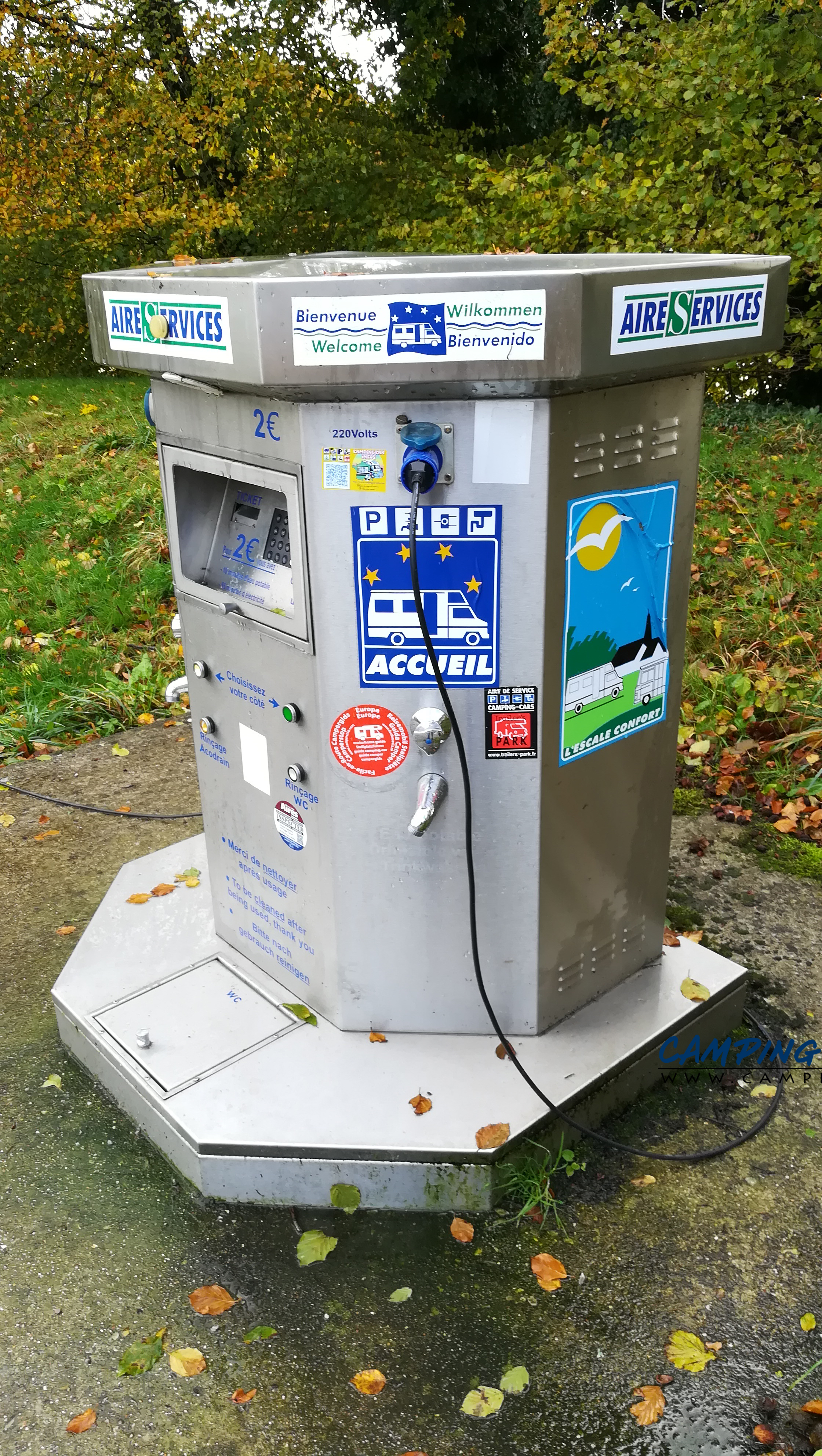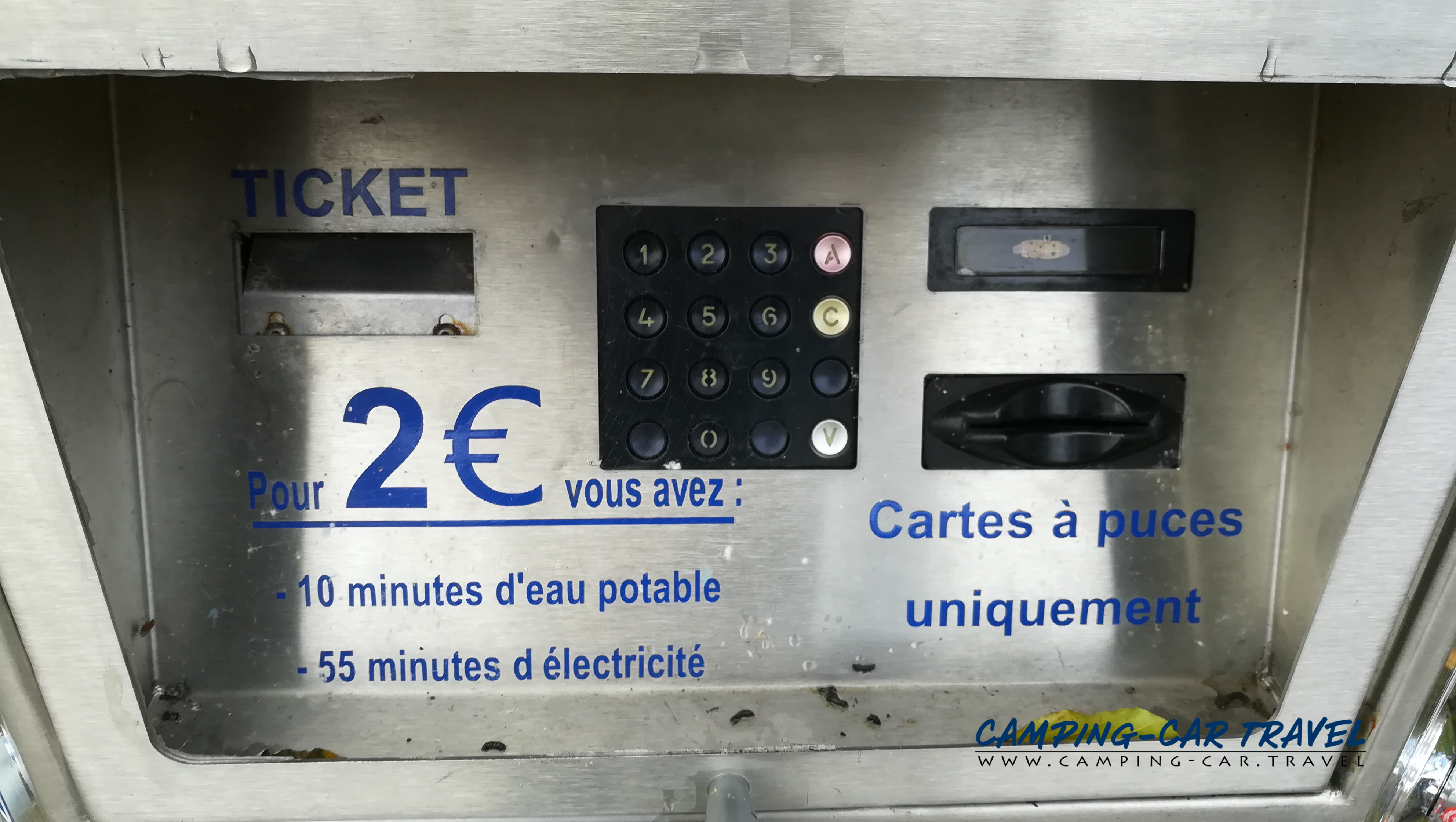 Le stationnement est gratuit. Les services sont normalement à deux euros pour dix minutes d’eau et une heure d’électricité mais le paiement par carte bancaire ne fonctionnait pas.
