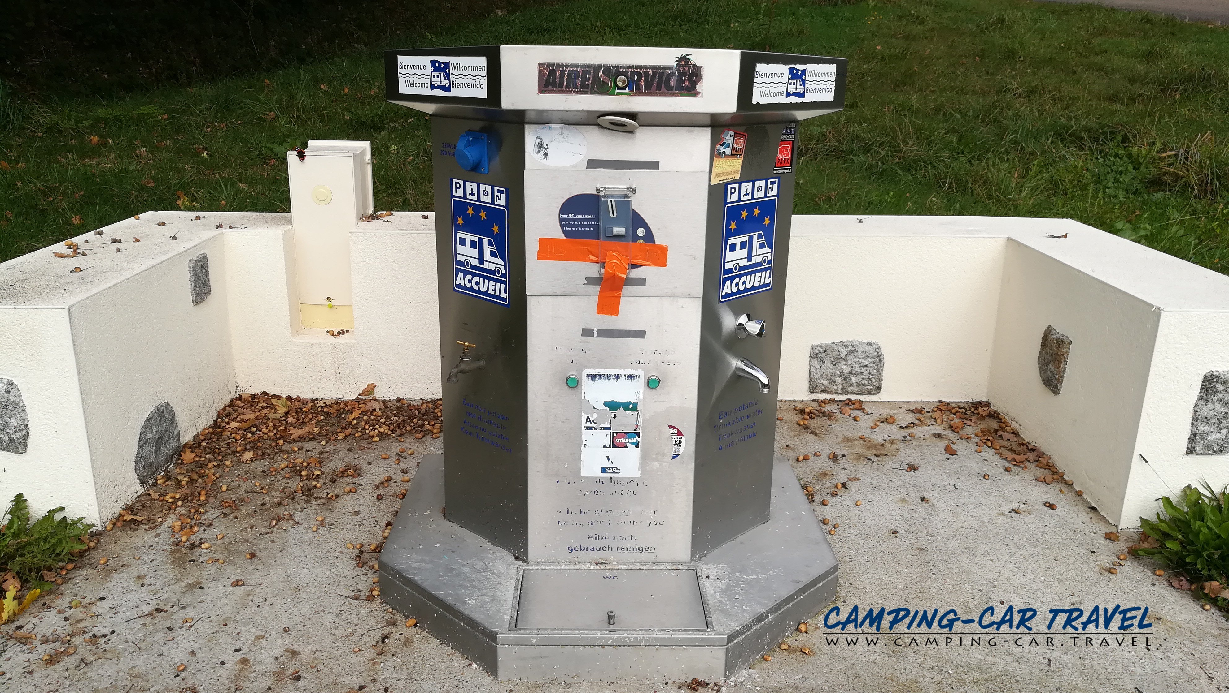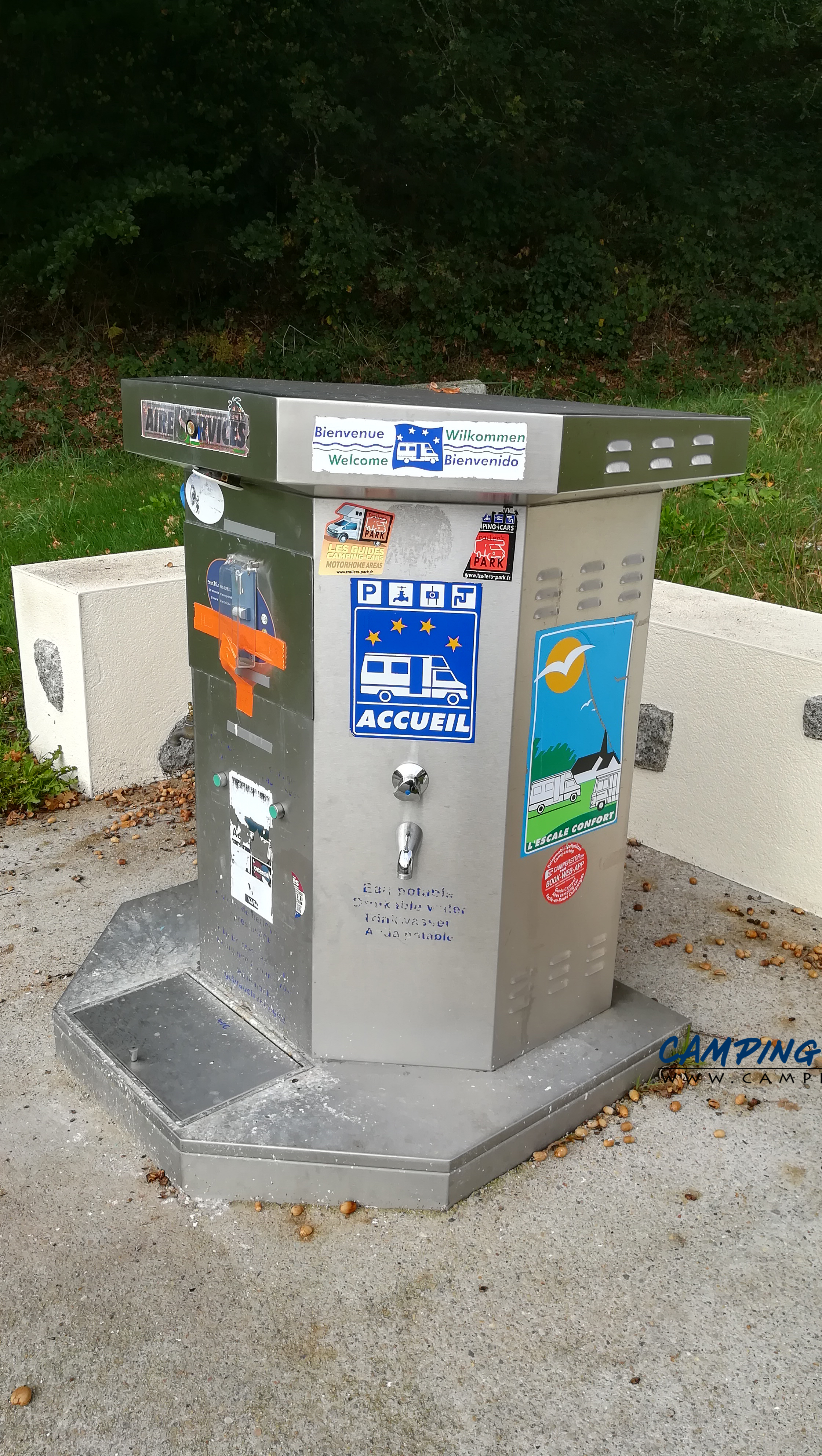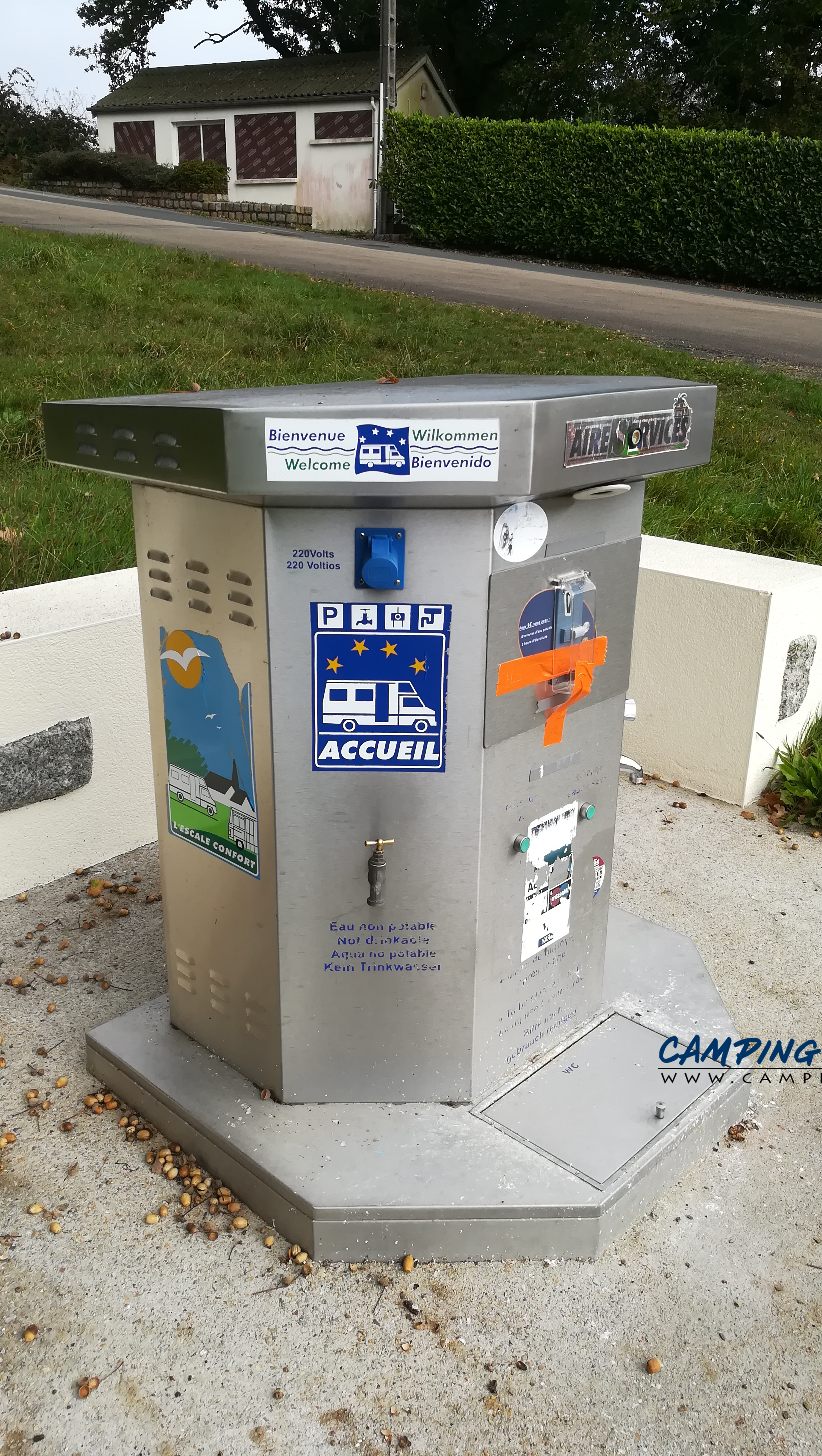 La borne est à l’entrée du camping. Le grand parking gratuit où vous pourrez stationner votre camping-car est juste à côté.