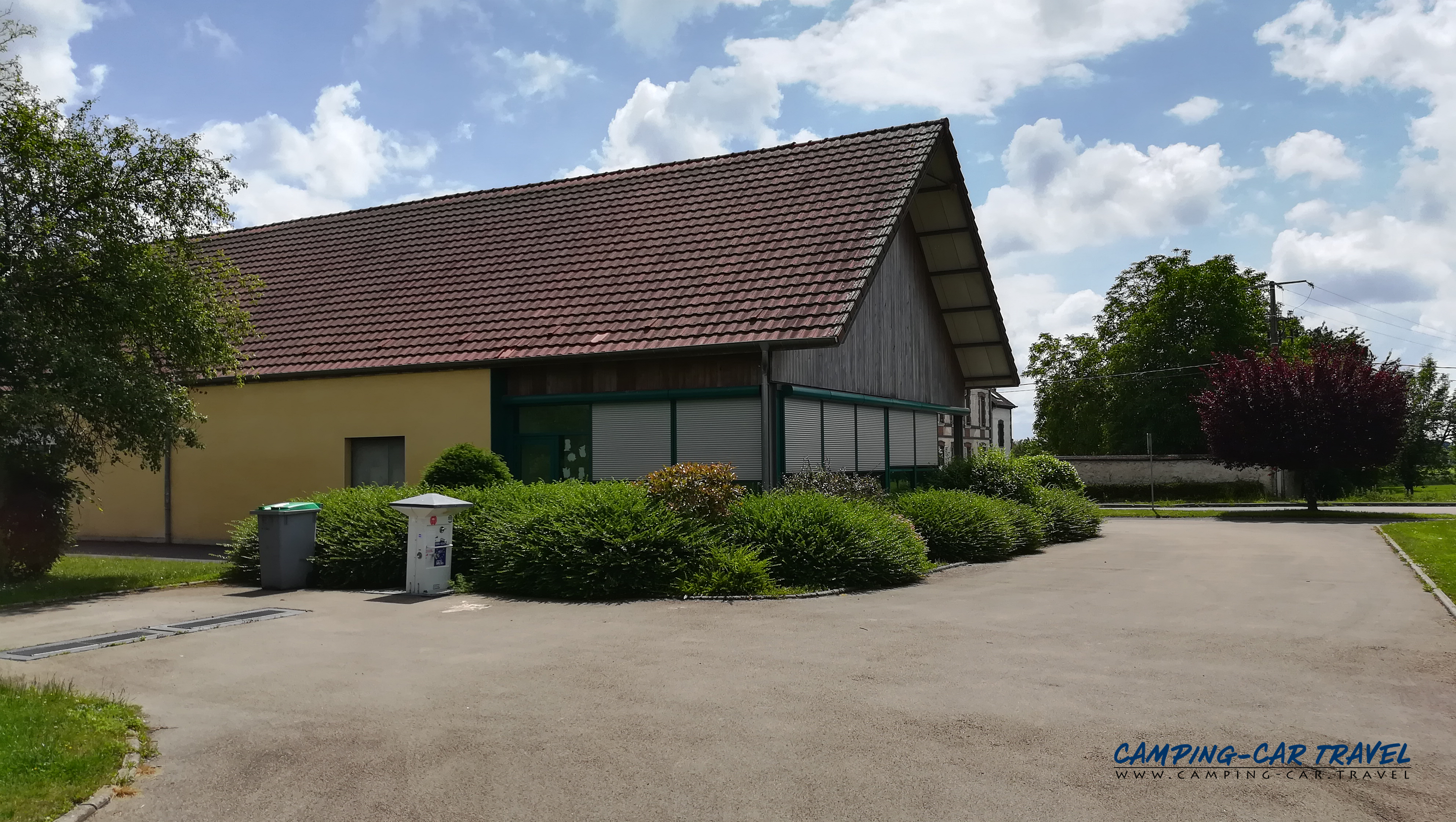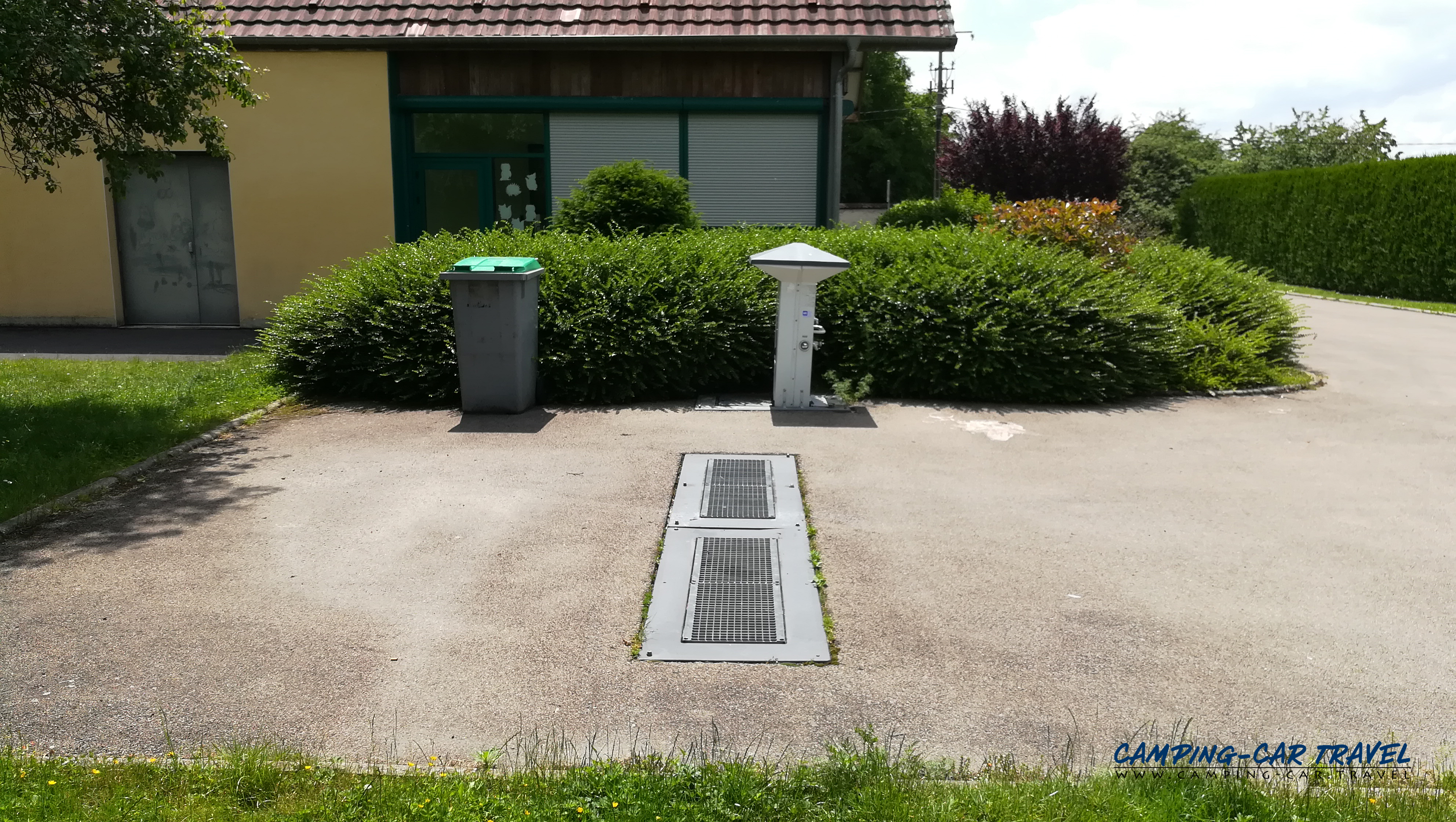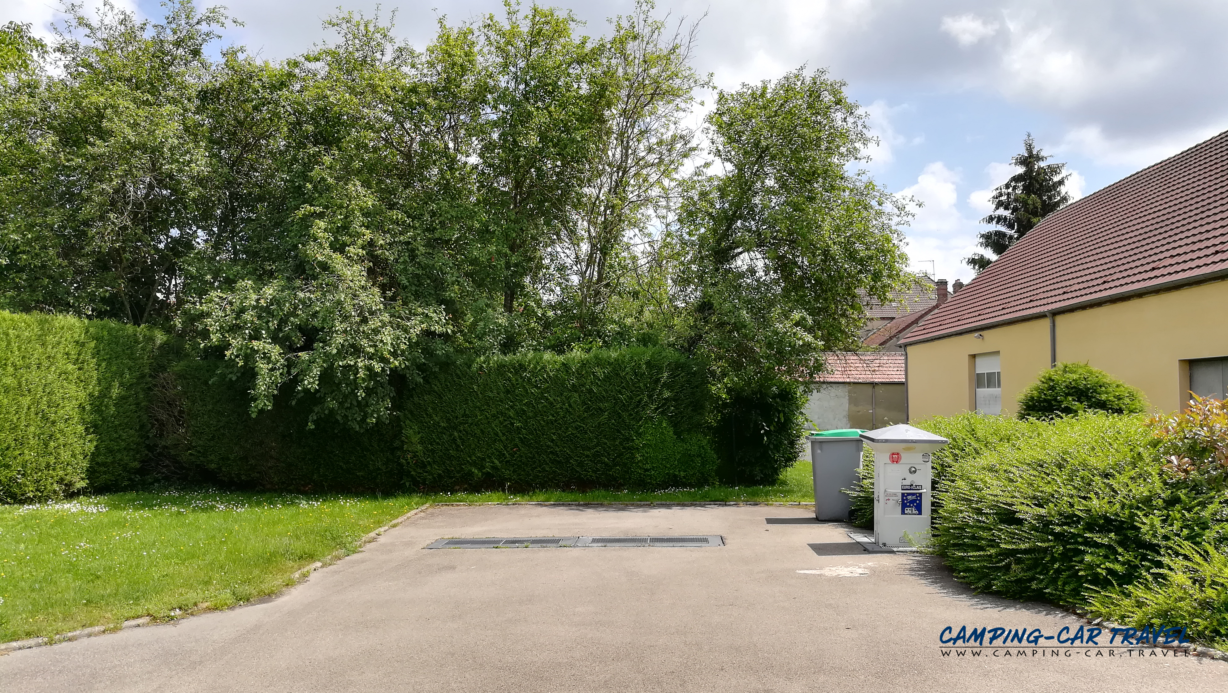 La borne se trouve à côté de la salle des fêtes où il est possible de stationner gratuitement sur le grand parking (le stationnement à côté de la borne n’est pas possible).