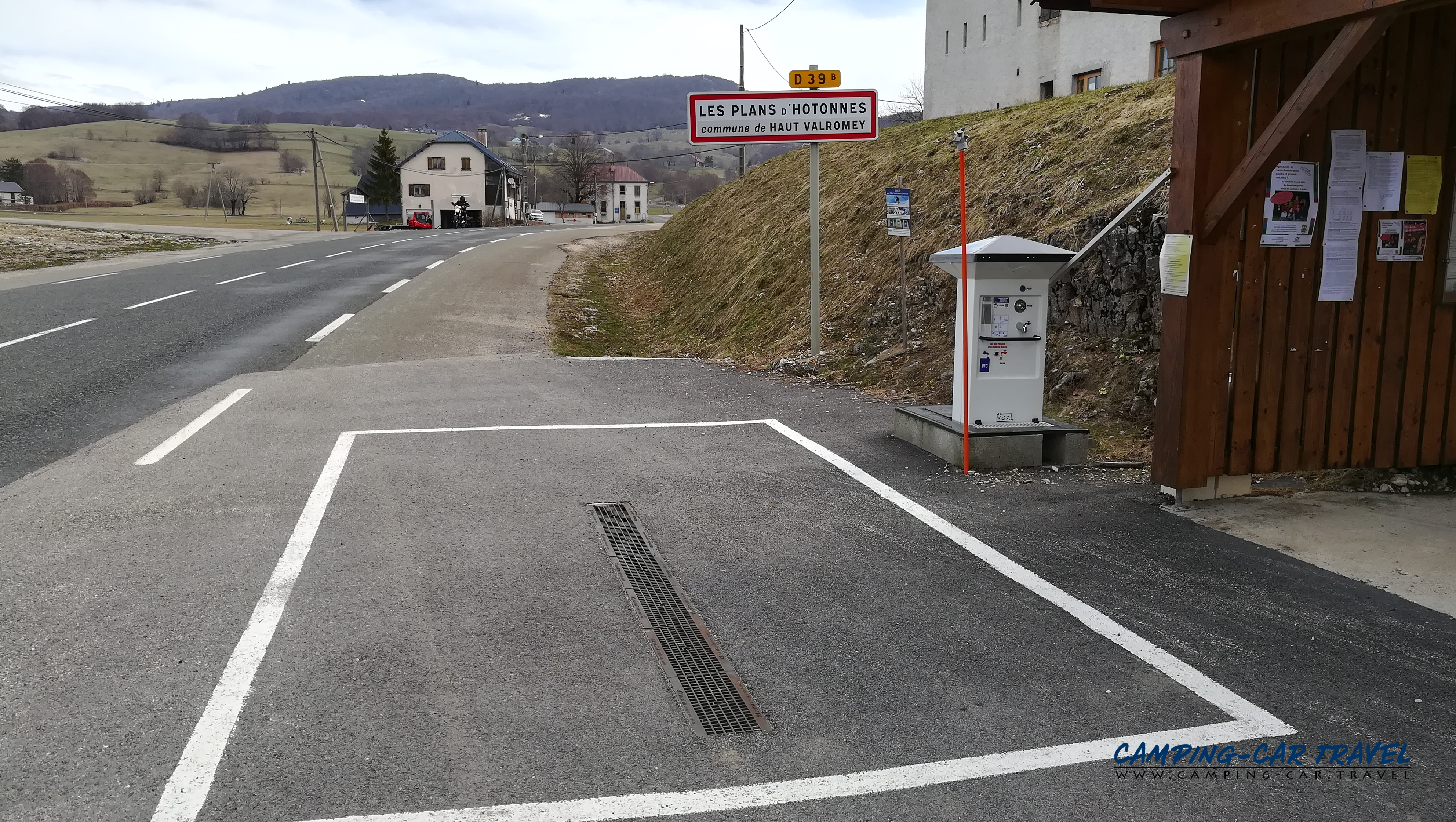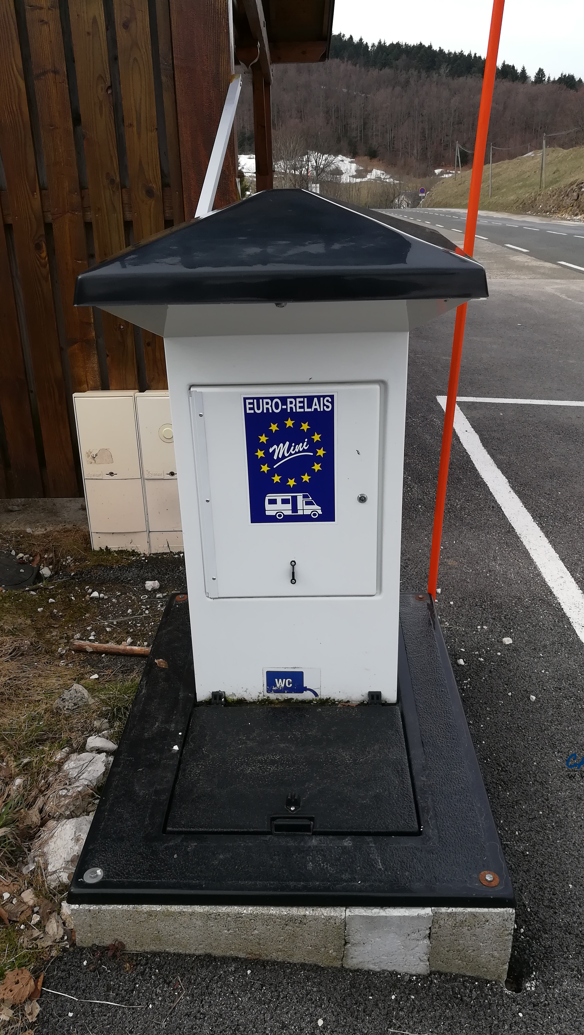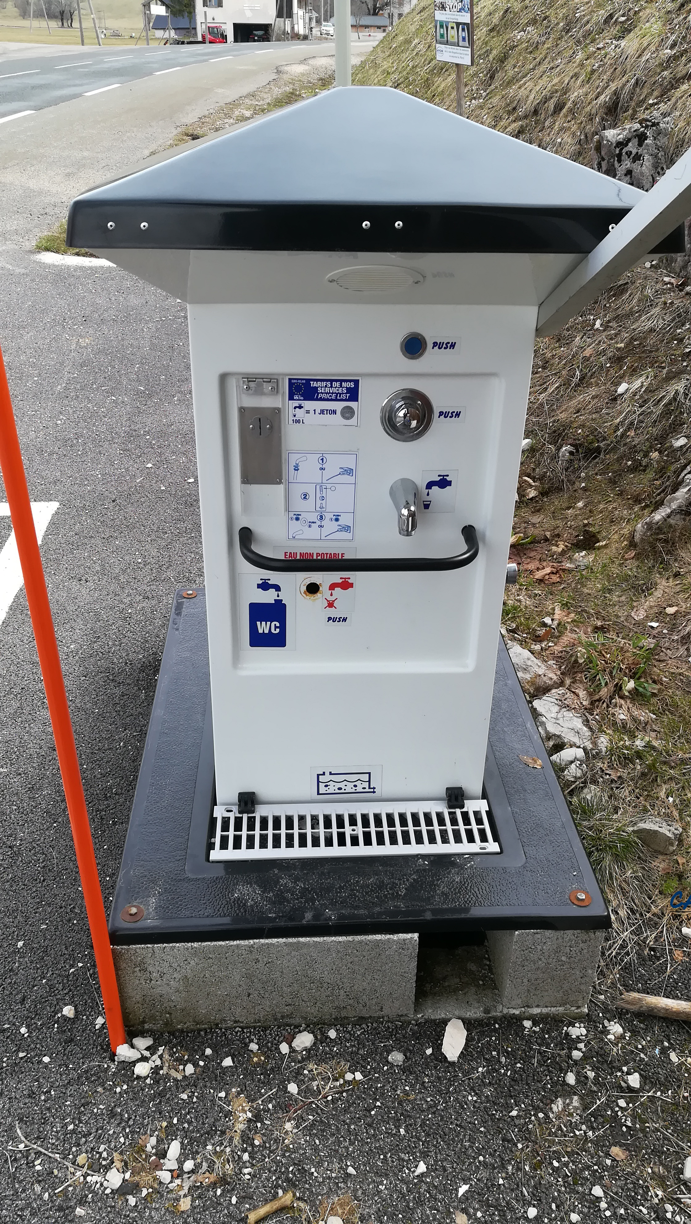 La borne de services est placée à l’entrée du hameau (ou à la sortie selon) à côté de toilettes publiques. Vous trouverez une liste des endroits où acheter les jetons sur place.