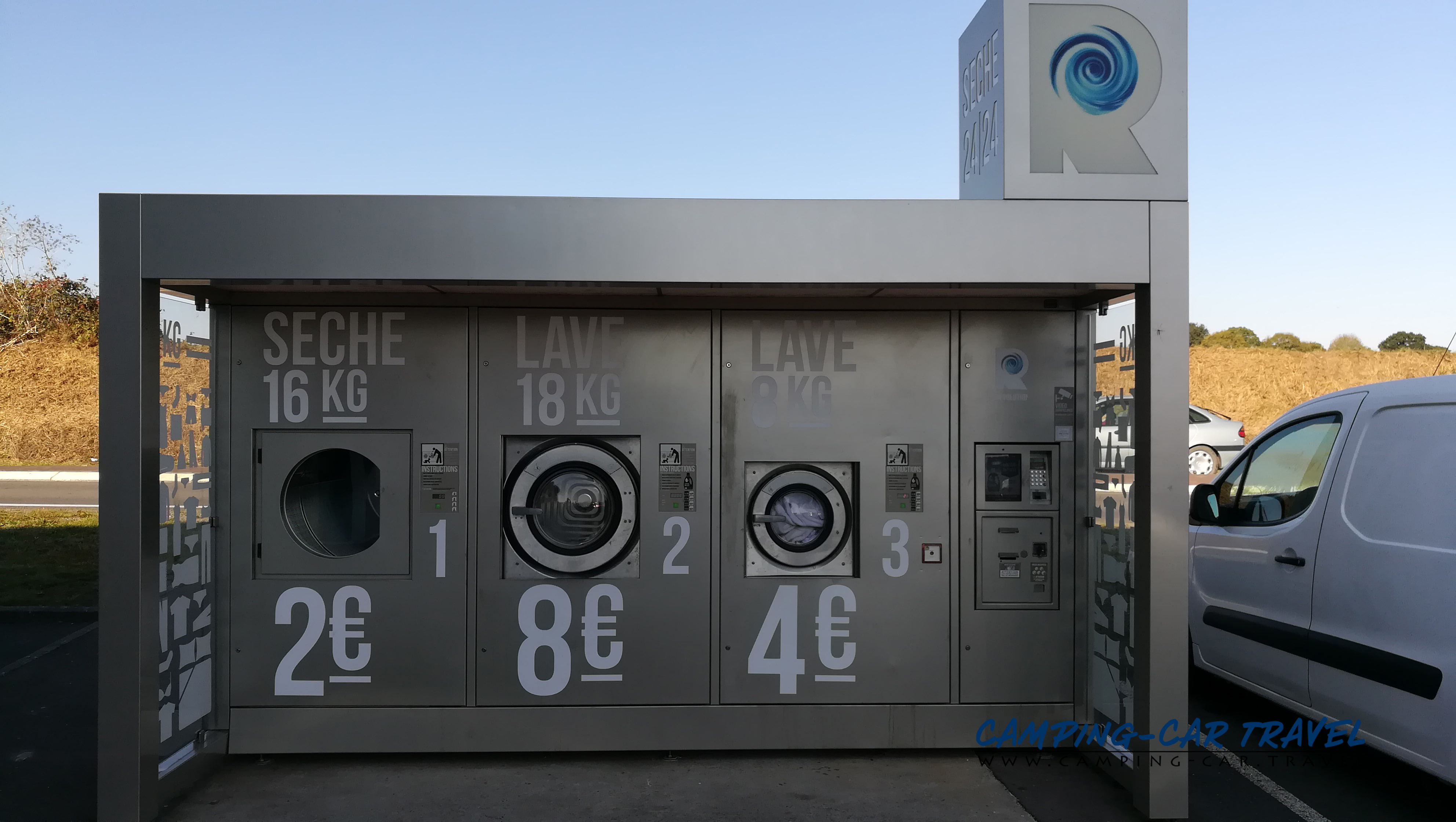 Le stationnement est entièrement gratuit, sans limite de durée affichée. Pour l’eau potable, le système est malin : si vous faites vos courses dans le magasin, le jeton vous est remis gratuitement à la caisse ; sinon, comptez 2 € pour 100 litres. La vidange des eaux grises est assurée sur place, à proximité immédiate du lavomatique qui jouxte les bornes — pratique pour une remise en état complète du véhicule.
